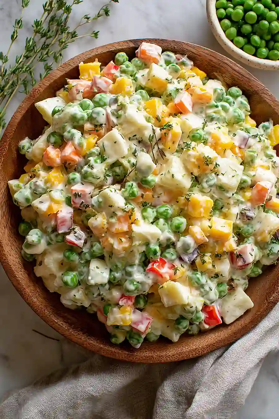 Another common error is using frozen peas straight from the freezer – make sure to thaw them completely and pat them dry with paper towels, otherwise excess moisture will water down your dressing and make the salad runny.