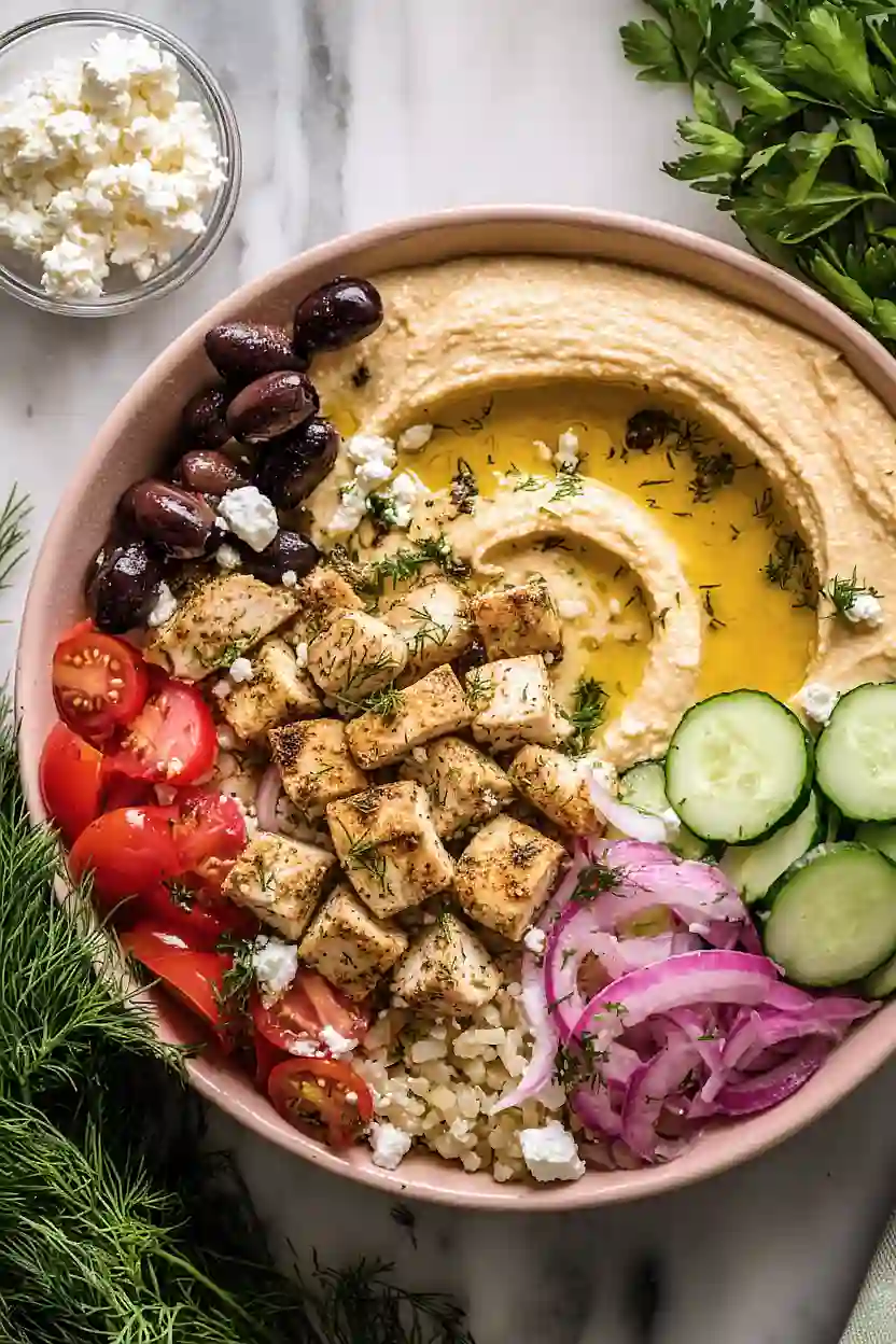 - Divide the hummus evenly among serving bowls, spreading it as a base. Top each bowl with a generous portion of the marinated chicken from Step 1, then arrange the prepped vegetables around it—cucumber, cherry tomatoes, kalamata olives, and pickled red onions. Scatter the crumbled feta cheese over the top. Drizzle the reserved marinade from Step 1 over each bowl for brightness and extra flavor. Finish with a sprinkle of fresh dill and serve immediately with warm bread for dipping.