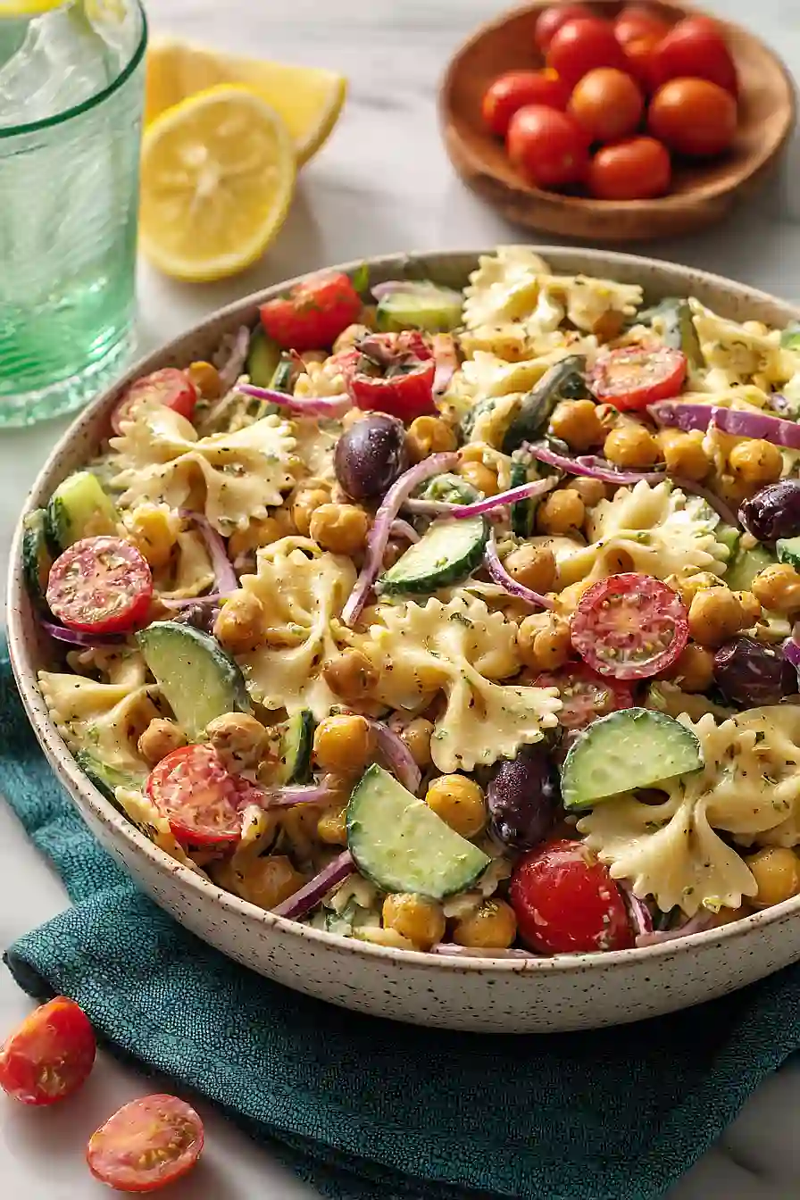 Delicious Easy Greek Pasta Salad with Chickpeas recipe with step-by-step instructions.