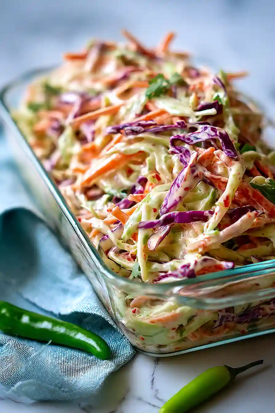 This spicy coleslaw is perfect alongside grilled meats like pulled pork sandwiches, barbecue chicken, or burgers where the cool, crunchy slaw balances out the richness of the meat. It also makes a great topping for fish tacos or as a side dish at your next cookout with hot dogs and ribs. If you’re keeping things simple, try it with some cornbread and baked beans for a classic barbecue spread. The coleslaw also works well stuffed into wraps or piled on top of sliders for extra crunch and a kick of heat.