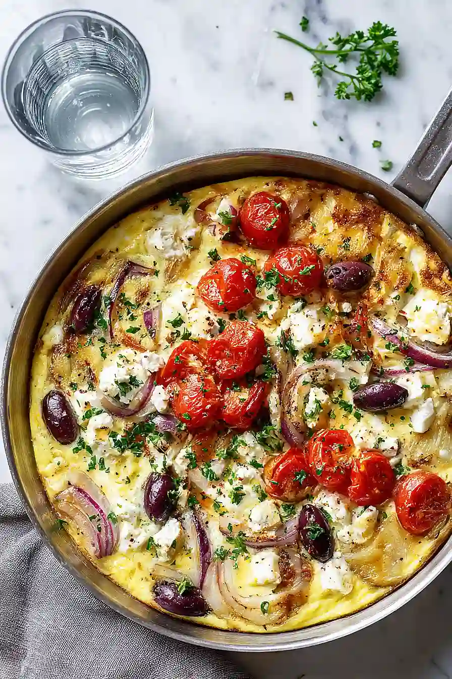 This omelette is pretty filling on its own, but I love serving it with some warm pita bread or toasted sourdough on the side for scooping up any extra bits. A simple side of roasted potatoes or hash browns makes it feel like a complete breakfast or brunch spread, especially if you’re feeding a crowd. If you want to keep things light, some fresh fruit like melon or berries works great to balance out the salty feta and olives. You could also serve it with a dollop of Greek yogurt mixed with a little lemon juice and dill for extra creaminess.